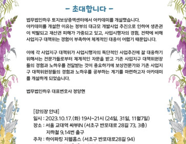 법무법인 하우에서 '정당보상실현을 위한 대책위의 역할 및 전략'이라는 주제로 아카데미를 진행합니다. 많은 관심부탁드립니다.