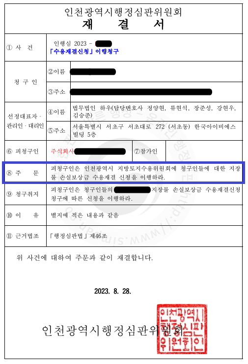 이에 법무법인 하우는 위 소유자들을 대리하여 사업시행자에게 관할 토지수용위원회에 위 지장물에 대한 보상절차인 손실보상금 수용재결 신청을 이행하라는 행정심판을 제기하였고,