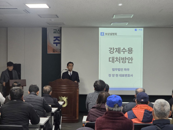 [법무법인 하우(대표변호사 정양현)]는 이날 창립총회 및 보상설명회에 참석하여 전반적인 수용 절차 및 강제수용 대처방안에 관한 설명을 진행하였습니다.