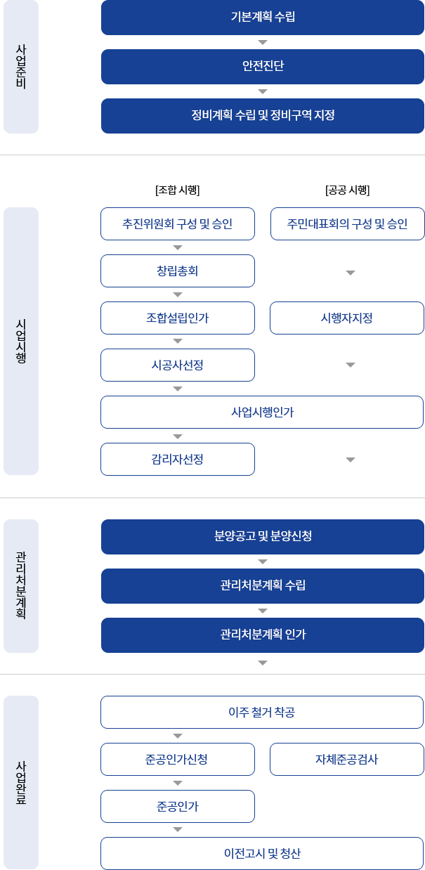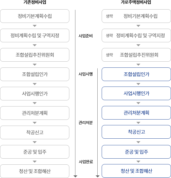 가로주택정비사업은 빈집 및 소규모주택 정비에 관한 특례법, 도시 및 주거환경정비법에 의거 도시‧주거환경정비기본계획의 수립, 정비계획의 수립 및 정비구역의 지정 없이 사업시행이 가능하여 절차간소화로 사업기간이 단축됩니다.