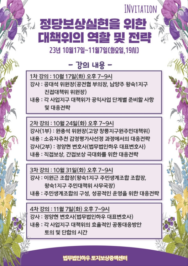 [토지보상] 토지보상 아카데미 개최 페이지 정보 법무법인 하우 작성일23-10-11 관련링크 http://lawfirmhow.com/ 241회 연결 수정 삭제 목록 답변 글쓰기 본문 법무법인 하우에서 '정당보상실현을 위한 대책위의 역할 및 전략'이라는 주제로 아카데미를 진행합니다. 많은 관심부탁드립니다. 수정 삭제 목록 답변 글쓰기