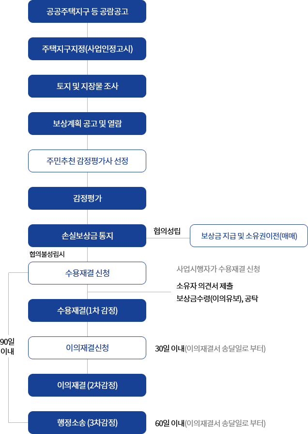 ※ 무허가건축물의 경우는 1989년 1월 24일 이전에 지어진 무허가(무신고)주거용 건축물은 적법한 건축물로 평가하여 보상하고 이주대책 수립대상자가 됨.